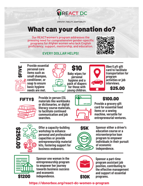 REACT DC provides compassionate, comprehensive, and cost-effective resettlement assistance for recently arrived Afghan refugees. The organization is driven by a leadership team of military veterans and spouses with 1100 supporting volunteers.
